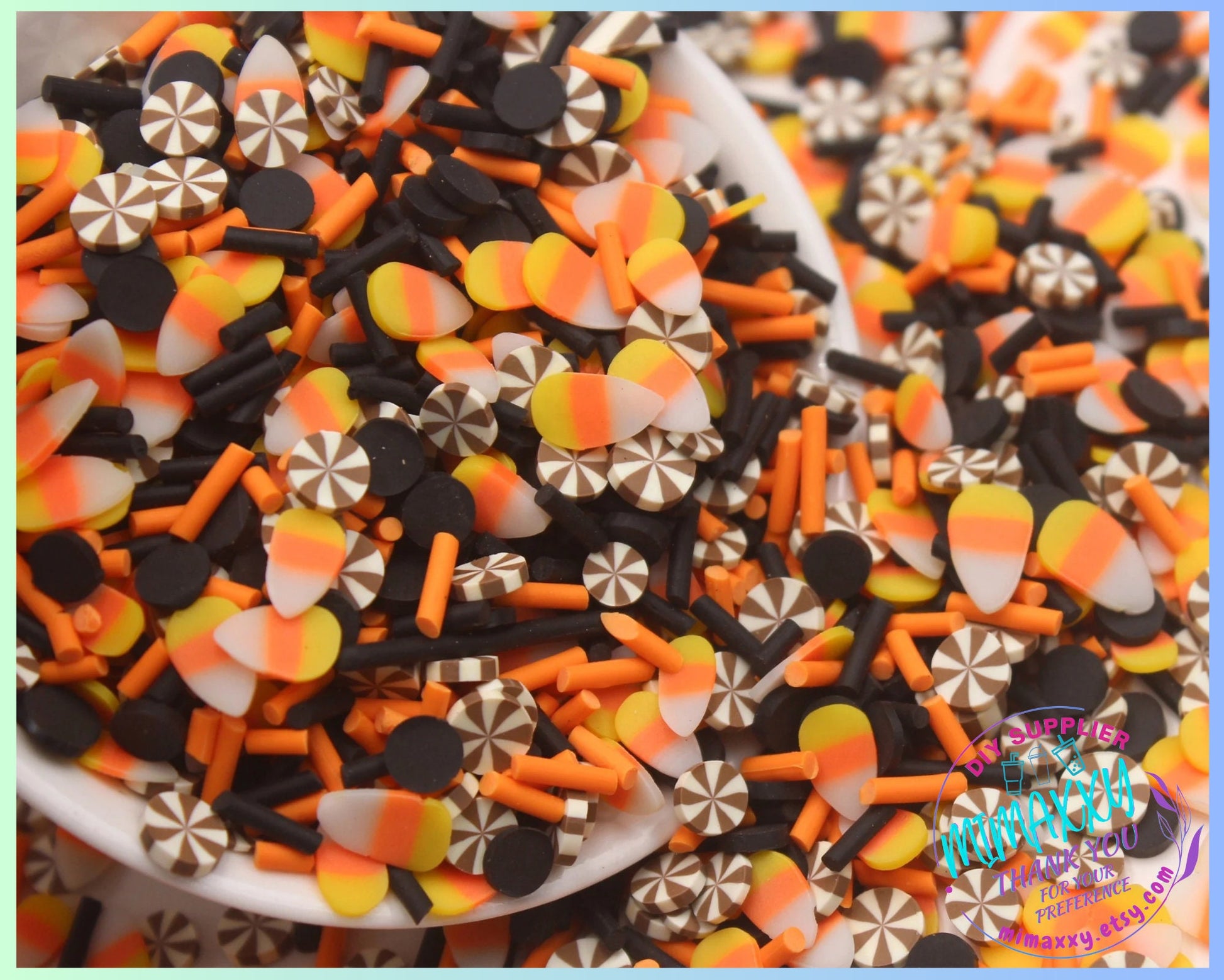5mm Happy Fall, candy corn/ Sprinkle, Slime Polymer Clay Slices, Fake Bake Nail, Craft, black, white, orange,